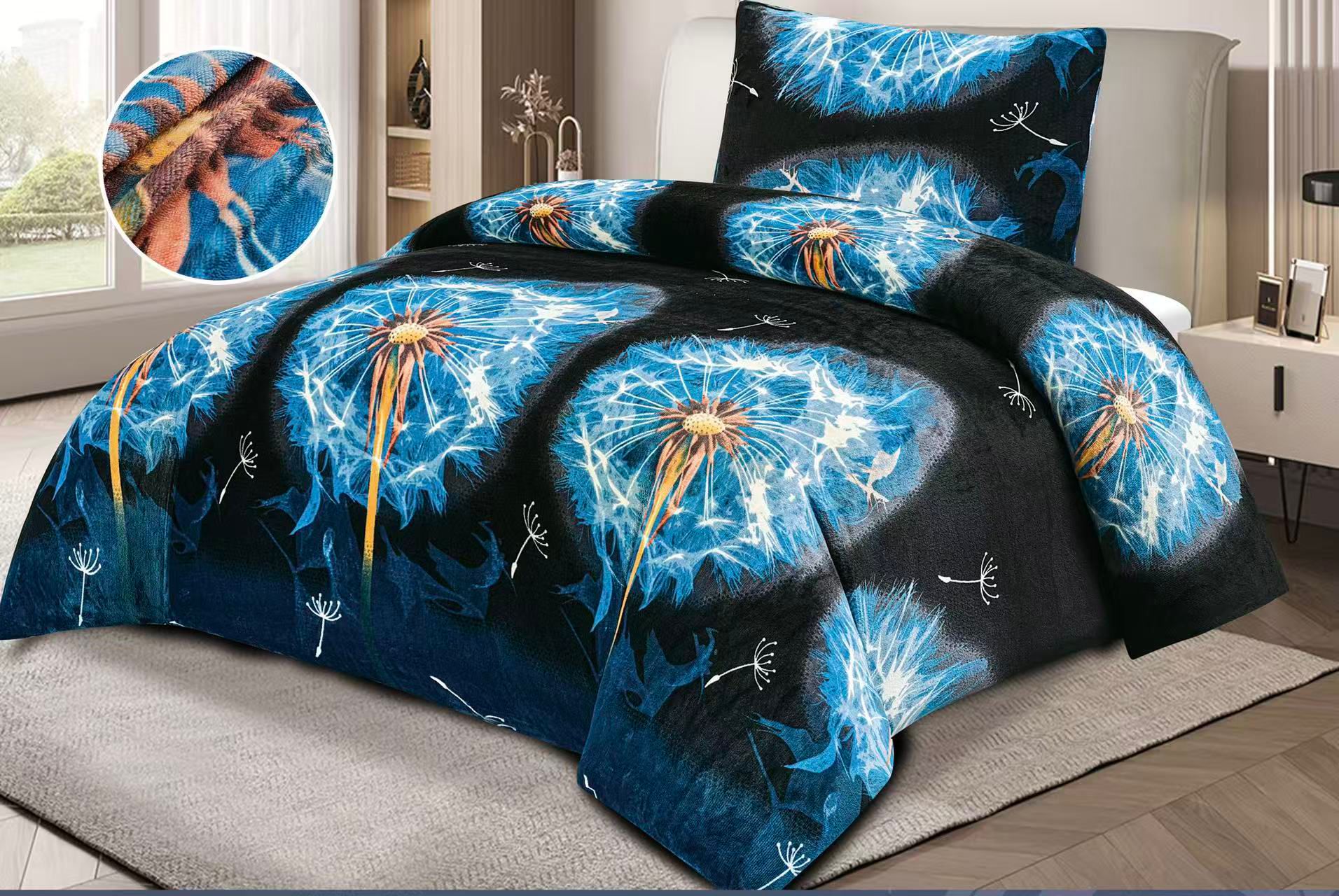 - NOVINKA 2026 - OBLIEČKY MIKROPLYŠ NA 2 POSTELE 70x90/140x200cm - PAMPELIŠKY MODRÉ + PROSTIERADLO ZADARMO -